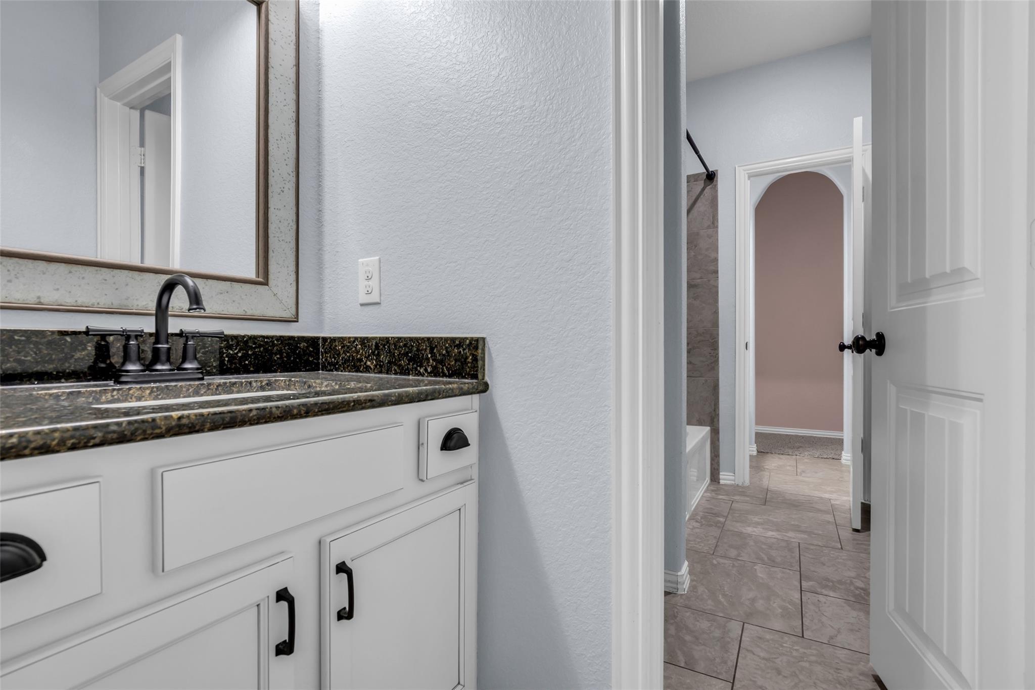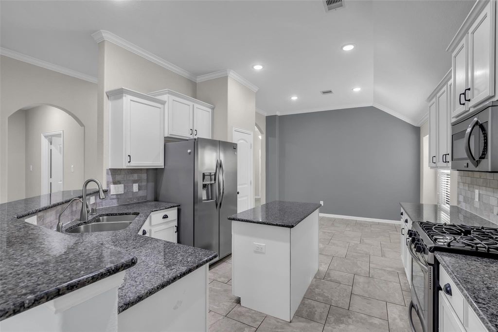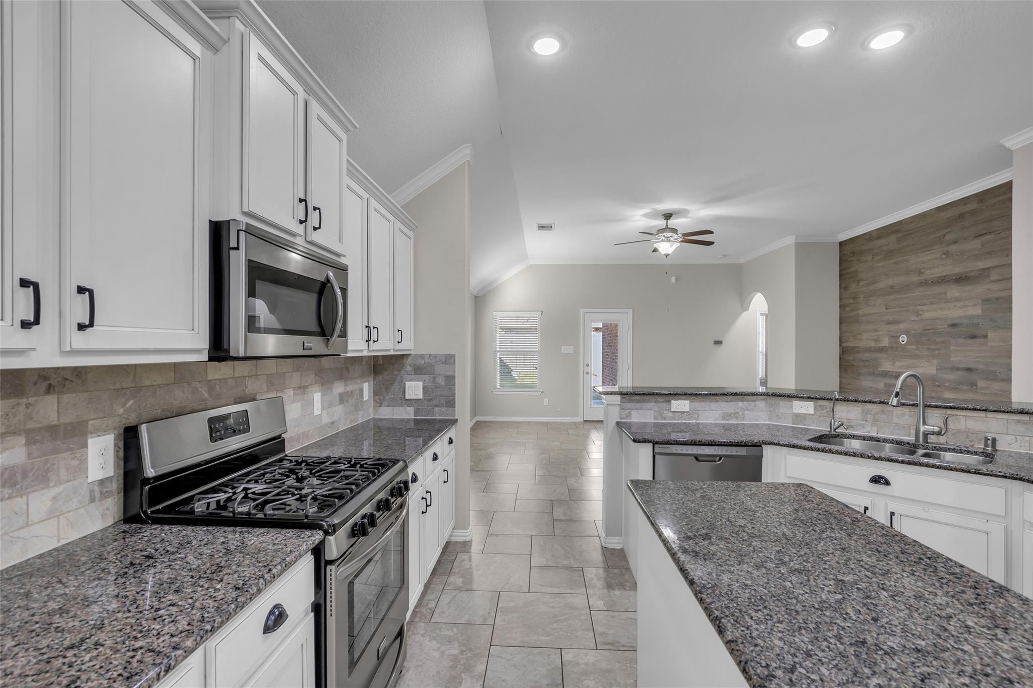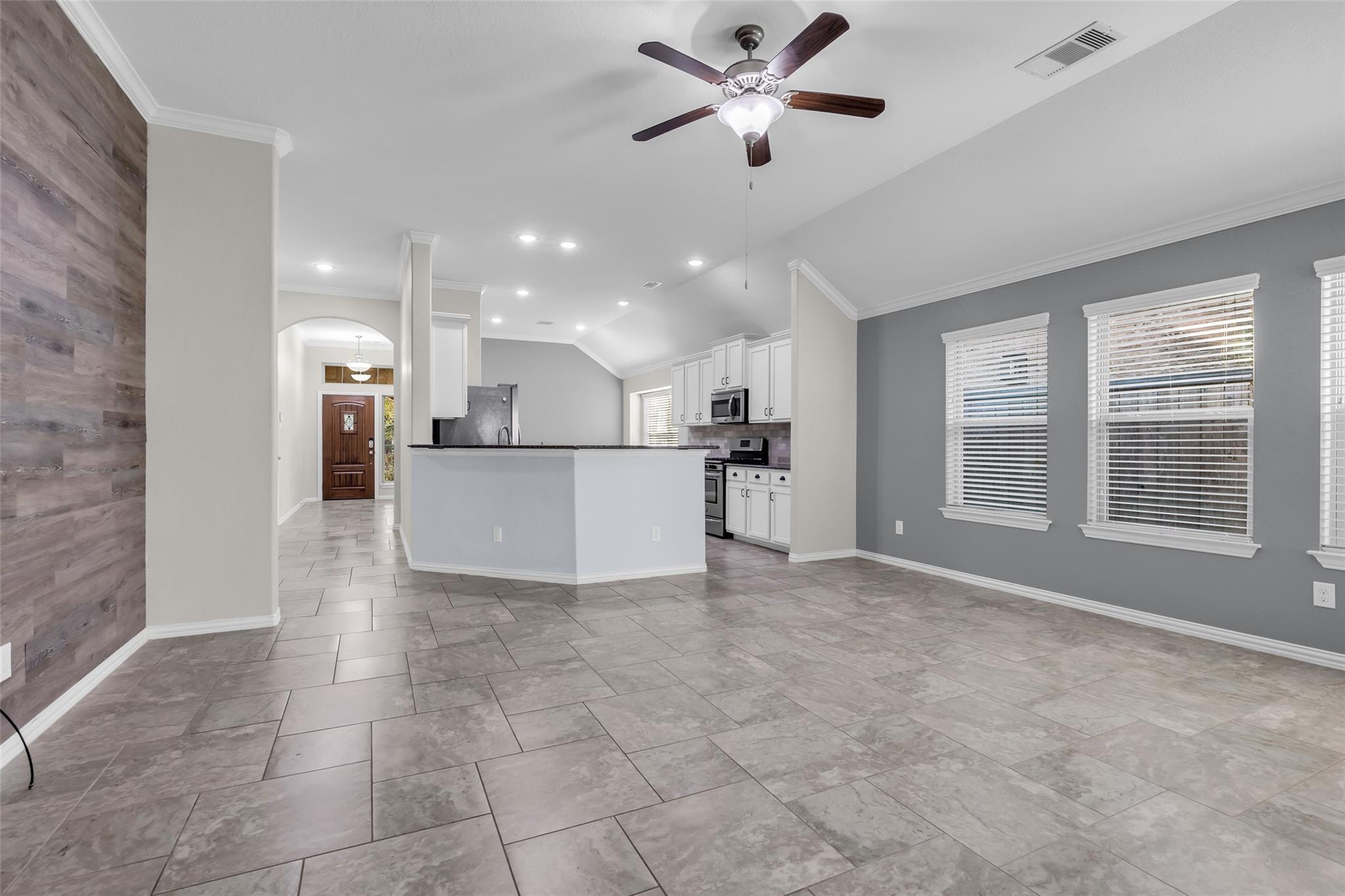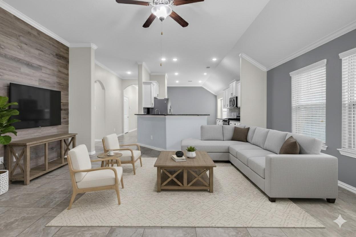 At the center of the home, the chef-inspired kitchen features crisp white cabinetry, sleek black hardware, granite countertops, and under-cabinet lighting. The open living area creates an inviting space for gathering, highlighted by a designer accent wall and stylish pinwheel-pattern tile flooring.